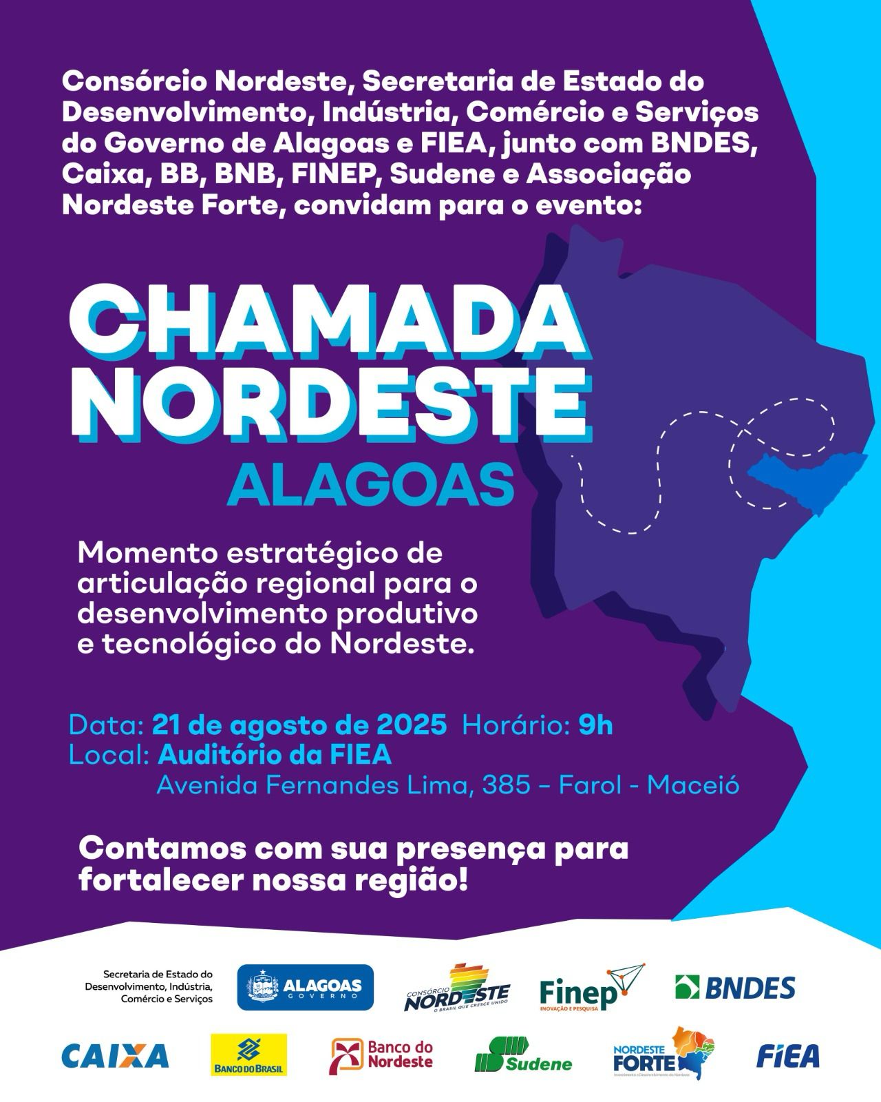 O Consórcio Nordeste, o Governo de Alagoas, por meio da Sedics, e a Federação das Indústrias do Estado de Alagoas, junto com BNDES, Caixa, BB, BNB, FINEP, SUDENE e Associação Nordeste Forte, convidam para o evento “Chamada Nordeste – Alagoas”.